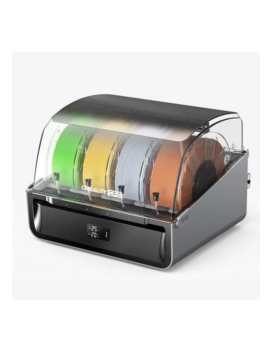 Add the Creality CFS Filament System to your K2 Plus or Hi Combo printer and start printing multicolour with its four filament dispensers, auto swapping, and moisture-proof storage. Link four units together to print up to 16 colours at once with this smart filament management system.